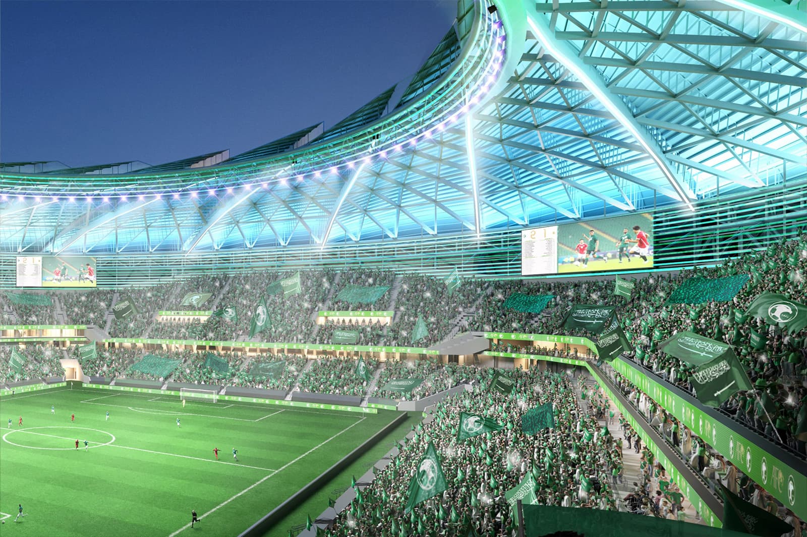 На стадионе в Саудовской Аравии по проекту студии Populous пройдут матчи Кубка Азии 2027 года. Арена рассчитана на 47 000 посадочных мест, а ее скульптурный силуэт вдохновлен движением волн и природными формами. Так, слегка наложенные друг на друга «паруса» фасада создают плавный ритм, позволяя естественному свету свободно проникать внутрь стадиона. В конструкцию интегрирована система охлаждения, призванная сделать пребывание игроков и зрителей более комфортным. Чтобы превратить арену в оживленную точку притяжения местного сообщества, команда предусмотрела торговые и развлекательные зоны, а также общественные пространства и центры цифрового спорта.