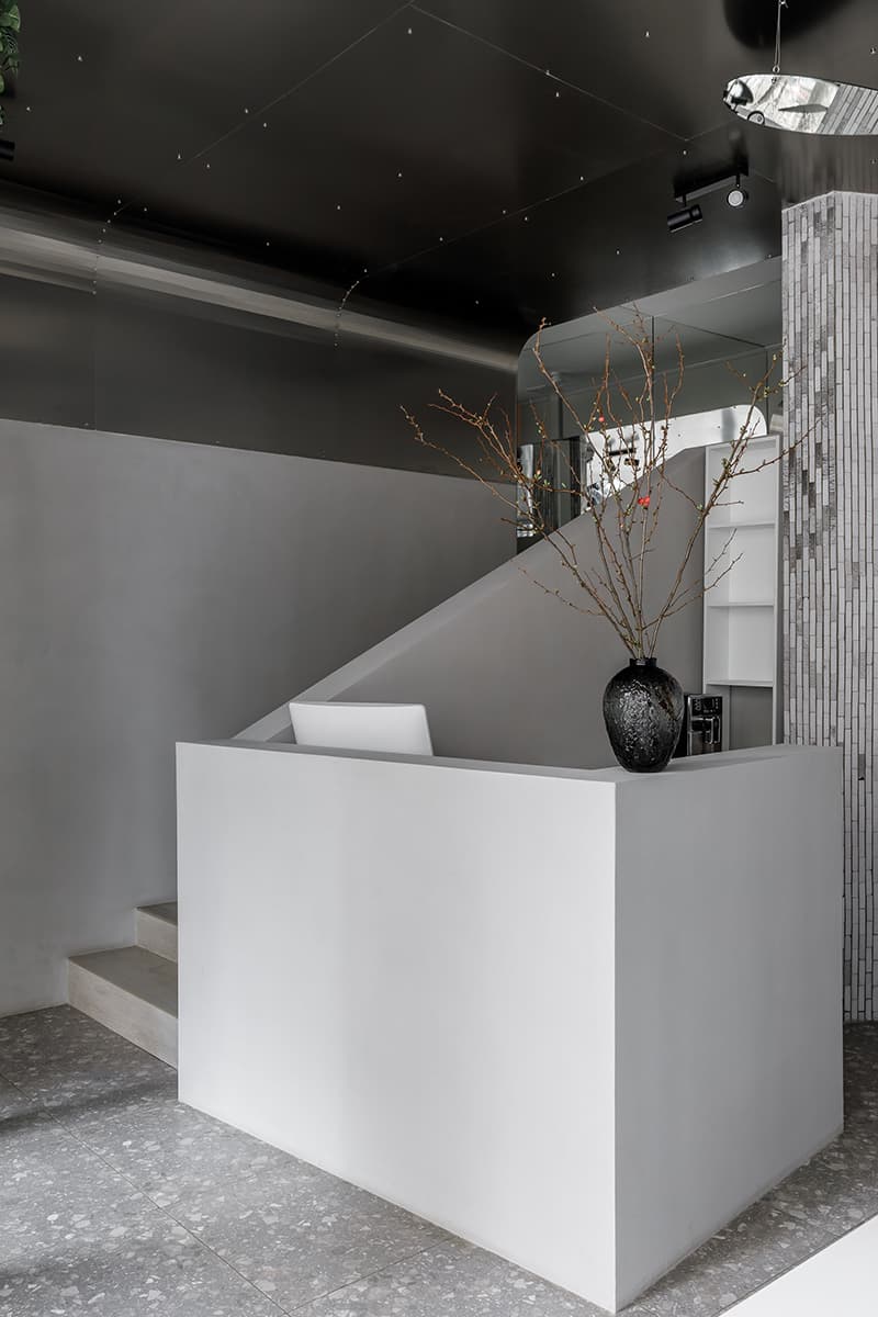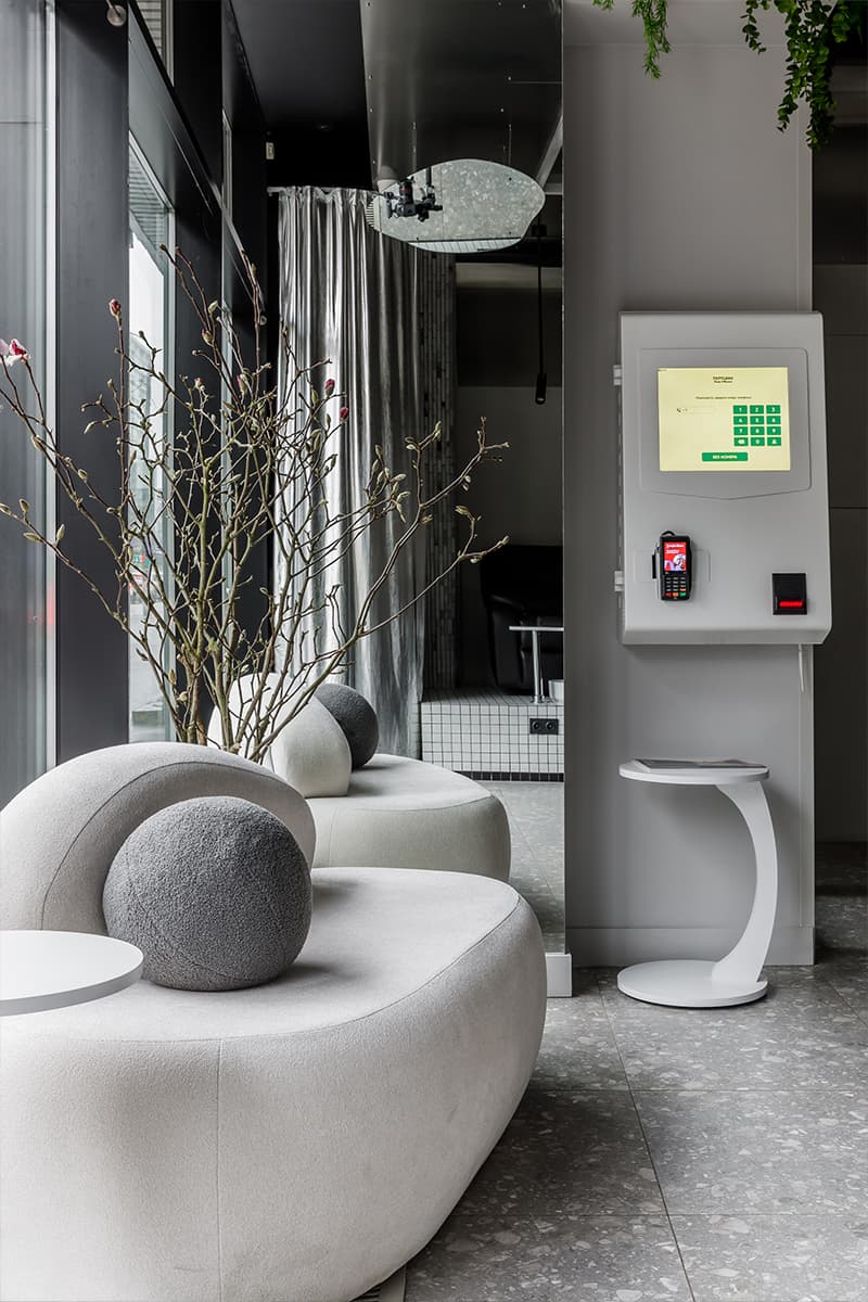 Зонирование пространства осталось в исходном виде, так как главной задачей дизайнеров являлось преображение интерьера с минимальными вмешательствами. Ключевыми недостатками исходного пространства были бетонные колонны, зашитые к моменту начала проектирования. Изначально их планировали очистить, отшлифовать и покрыть лаком, но после демонтажа на поверхностях обнаружили советскую плитку в хорошем состоянии. Ее сразу решили вписать в обновленную концепцию оформления. Еще одной неожиданной сложностью проекта оказалось кованое ограждение с растительными мотивами — оно не соответствовало задумке дизайнеров, но не подлежало сносу. В результате конструкцию зашили гипсокартоном и оштукатурили в тон стен. Источником вдохновения команды Sogret Buro стало название салона — Tattlers, «сплетники» в переводе с английского. Смелость заказчицы и атмосфера «свободной от осуждения» зоны подсказали идею серого моноколора и зеркальных поверхностей. Оформление должно было располагать к отдыху и расслаблению, поэтому в проекте задействовать только простое освещение. Технические лампы подчеркнули рабочие места и проходы: свет от них отражается в металлических потолках с радиусами. Они оказались сложными в реализации — такие решения никто прежде не использовал в России. Единственный красный светильник играет роль навигационного акцента, указывающего путь к санузлу.
