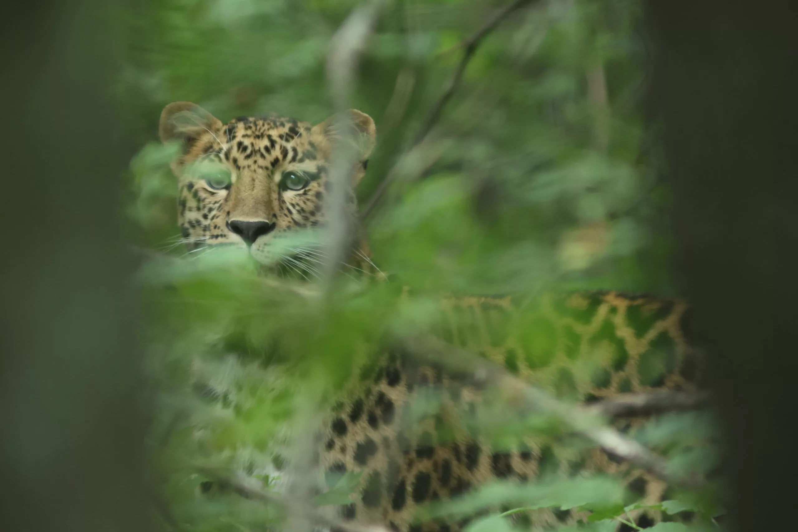Редкая встреча произошла в центральной части национального парка в Приморье: сотрудники на автомобиле проверяли в лесном массиве фотоловушки, когда неожиданно встретили пятнистую кошку. Распознав присутствие человека, леопард незамедлительно скрылся и затаился в кустах в 10-15 метрах.