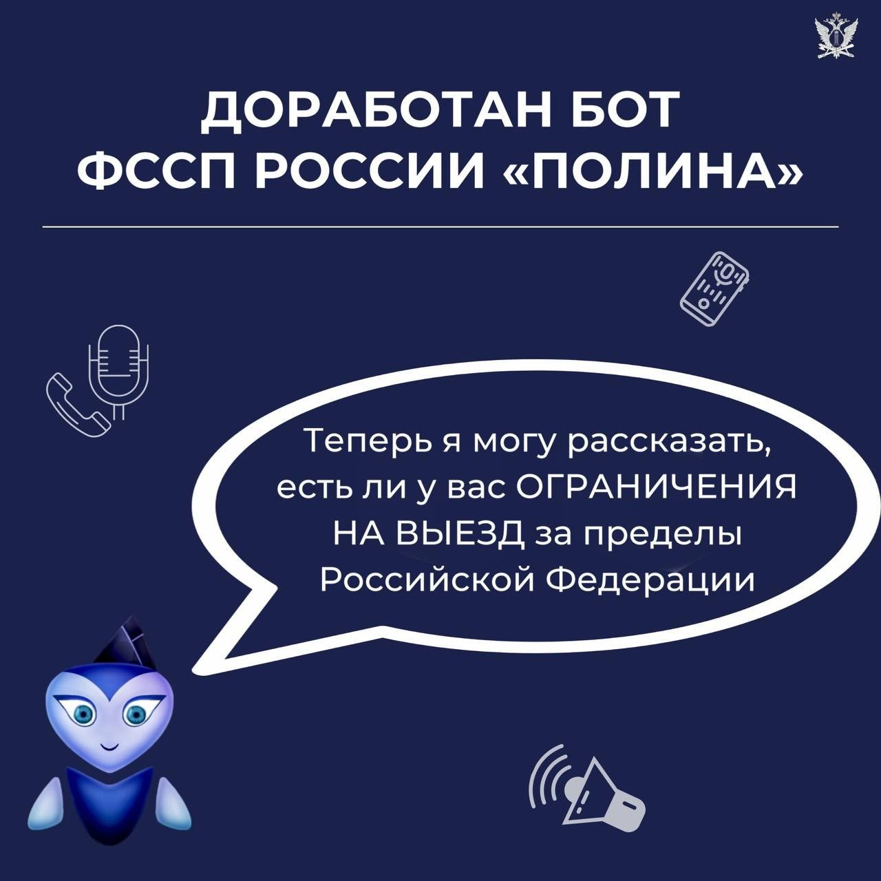 В центре телефонного обслуживания Федеральной службы судебных приставов по номеру 8-800-303-0000 доступен виртуальный помощник – голосовой бот «Полина», с помощью которого можно узнать информацию о своих задолженностях в службе судебных приставов.
