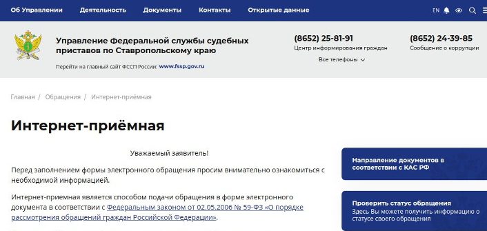 Для обращения необходимо зайти на официальный сайт r26.fssp.gov.ru, затем в разделе «Интернет — приемная» заполнить личные данные и оставить заявление, прикрепив необходимые документы.