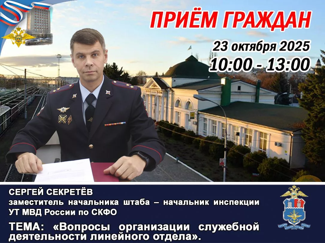 23 октября 2025 года с 10:00 до 13: 00 в административном здании в приемной Нальчикского ЛО МВД России на транспорте (г. Нальчик) по адресу: г. Нальчик, ул. Осетинская, 132А состоится личный прием граждан заместителем начальника штаба – начальник инспекции УТ МВД России по СКФО полковник внутренней службы Сергеем Секретёвым, по вопросам организации служебной деятельности линейного отдела.