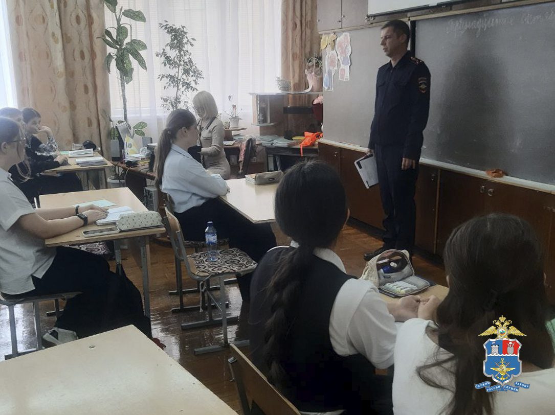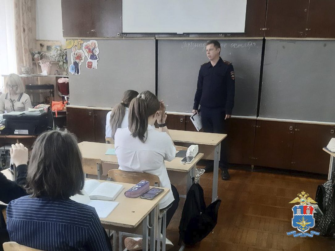 Инспектор по делам несовершеннолетних линейного отдела полиции на станции Кисловодск капитан полиции Евгений Губин совместно с директором МОУ СОШ № 1 города Ессентуки Татьяной Ващилиной и социальным педагогом Викторией Дуйдовой провели профилактическую встречу с учениками школы.