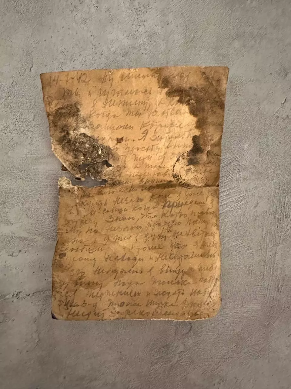 Документы серьёзно повреждены, однако текст одного послания сохранился: 8 августа 1942 года родственники из Чувашии пишут Ольге Васильевне, проживающей на улице Марата, рассказывают о жизни в тылу и помощи эвакуированным ленинградцам. Вторая открытка датирована 14 июля 1942 года, но адресат пока не установлен — прочтение станет возможным после реставрации.