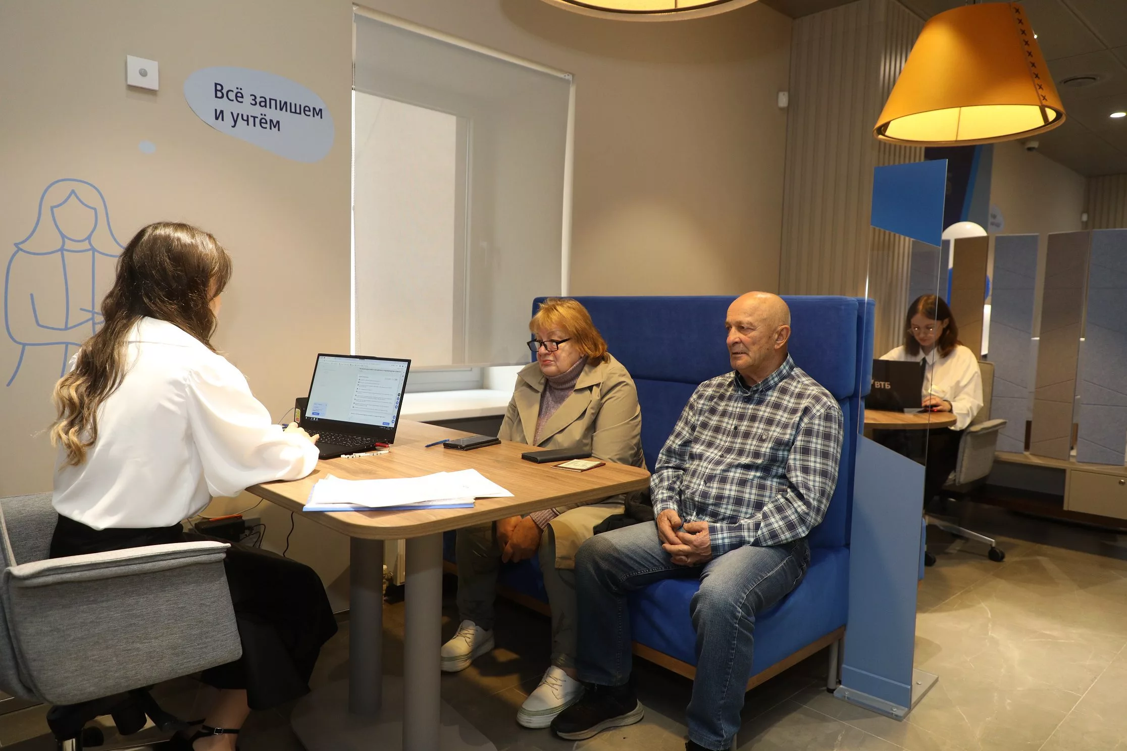 В офисе организованы комфортные зоны обслуживания, для конфиденциальных вопросов предусмотрена переговорная комната. Посетители могут подключиться к бесплатной сети Wi-Fi, два банкомата с поддержкой операций по QR-коду доступны круглосуточно.
