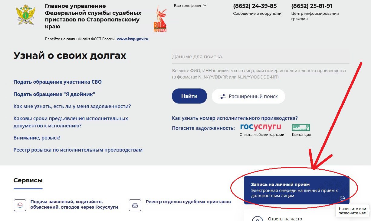 Для записи на личный прием необходимо зайти на официальный сайт r26.fssp.gov.ru, затем в разделе «Сервисы» выбрать «Запись на личный прием к должностным лицам территориальных органов ФССП России».